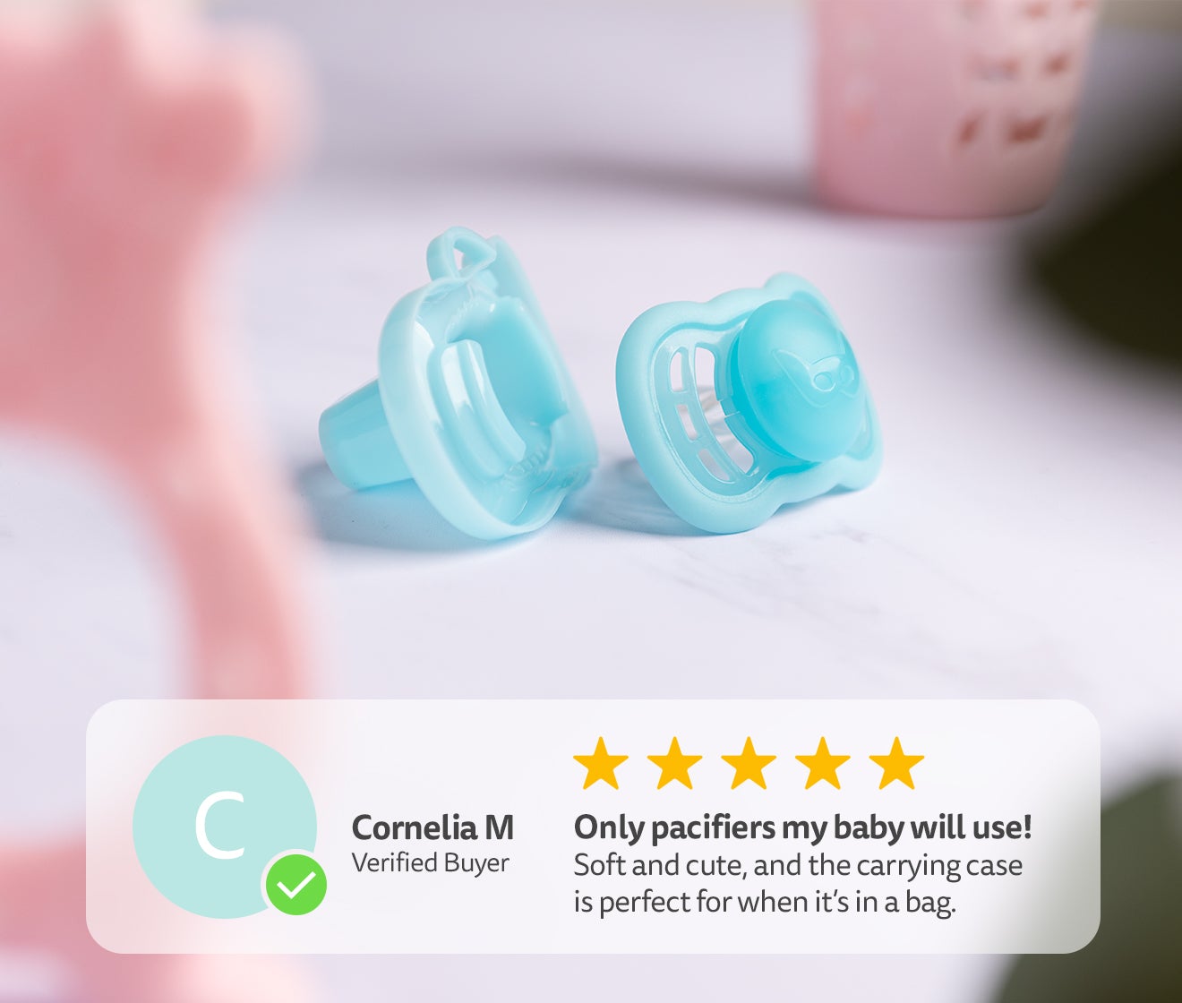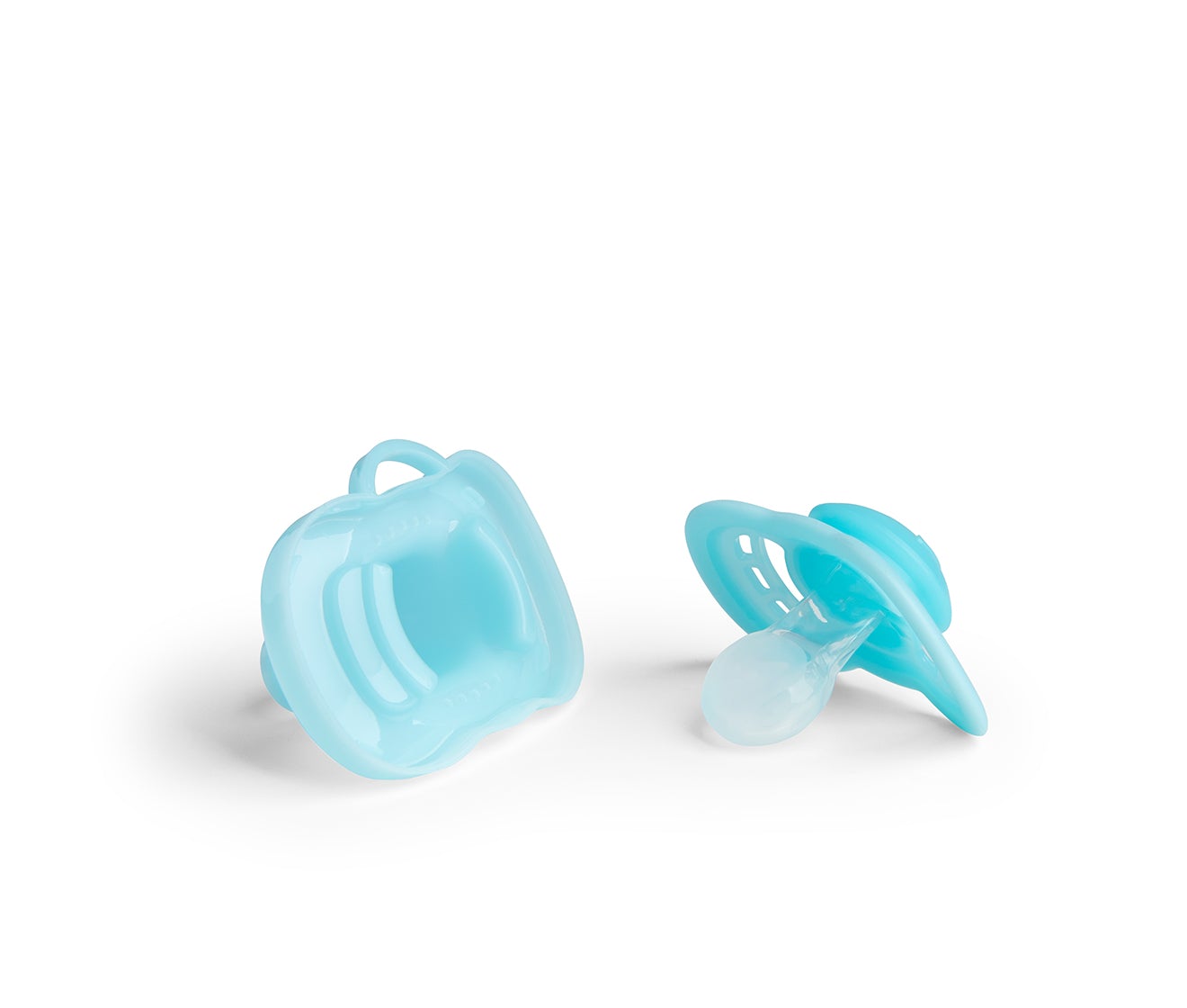 Nappen har en tunn och mjuk sugdel i silikon som är utformad för att passa perfekt i bebisens mun.