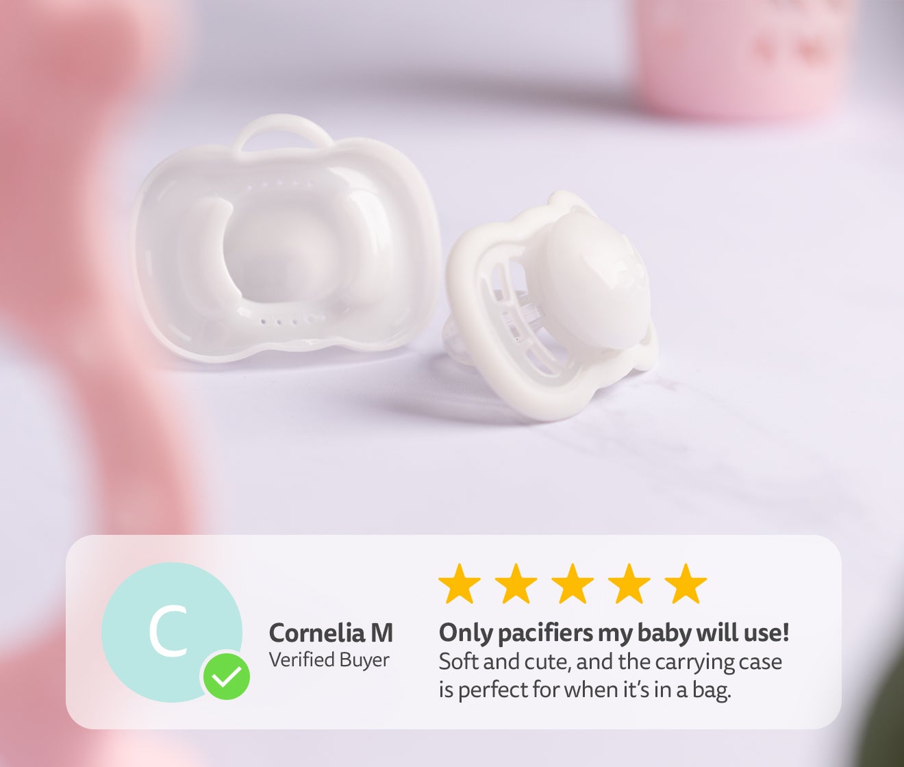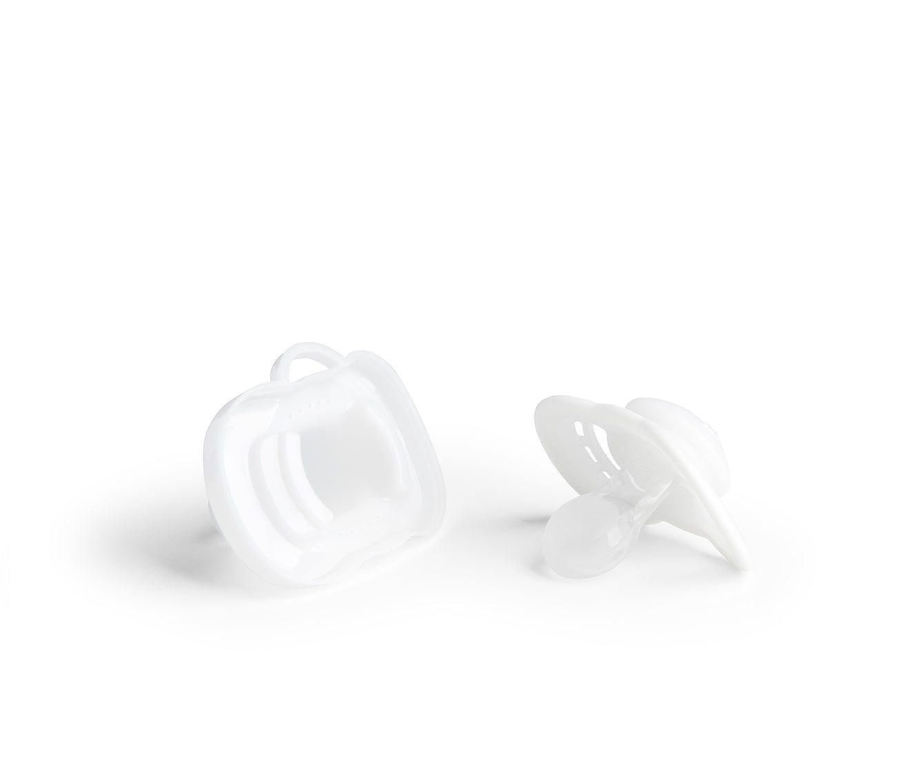 Nappen har en tunn och mjuk sugdel i silikon som är utformad för att passa perfekt i bebisens mun.