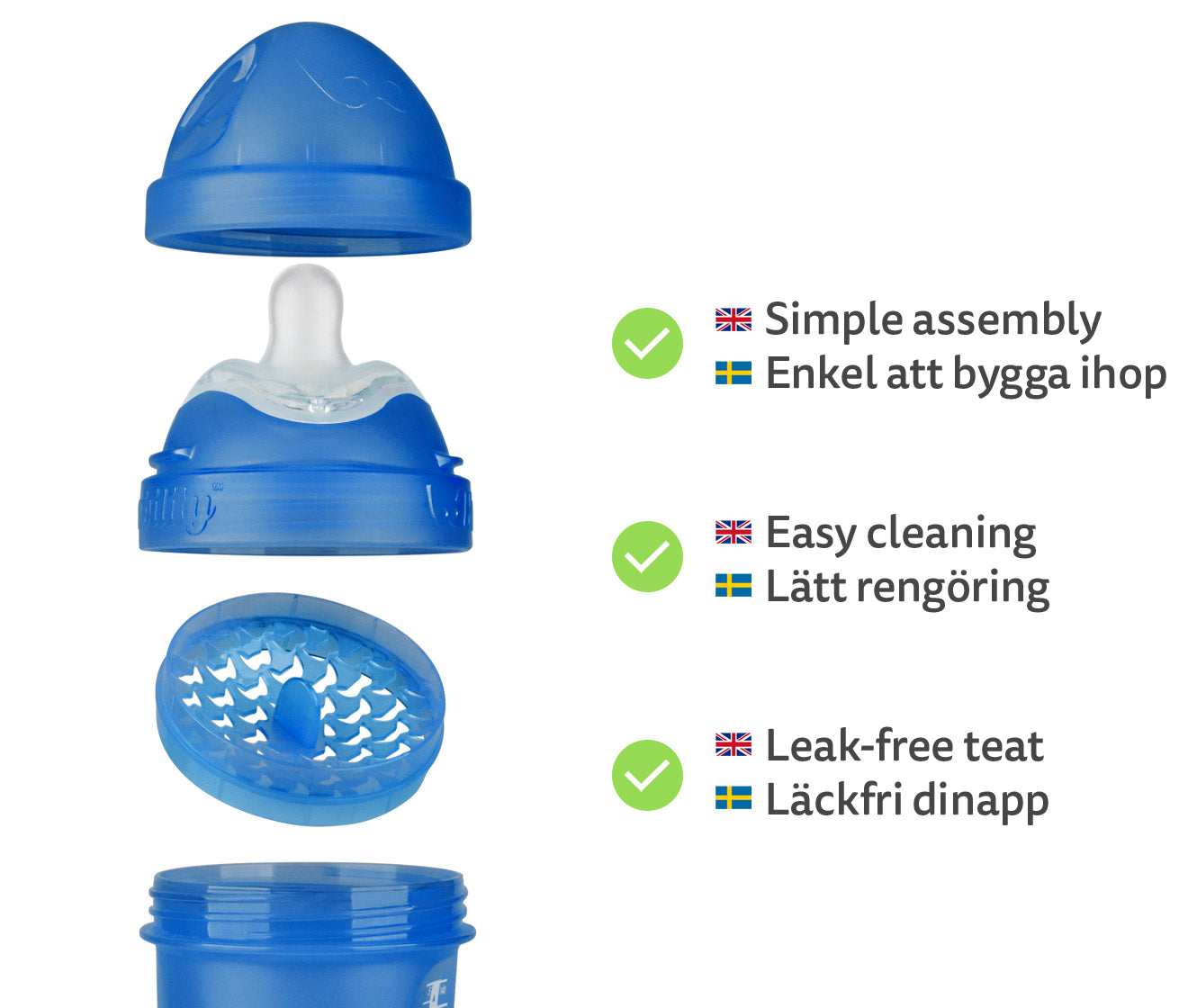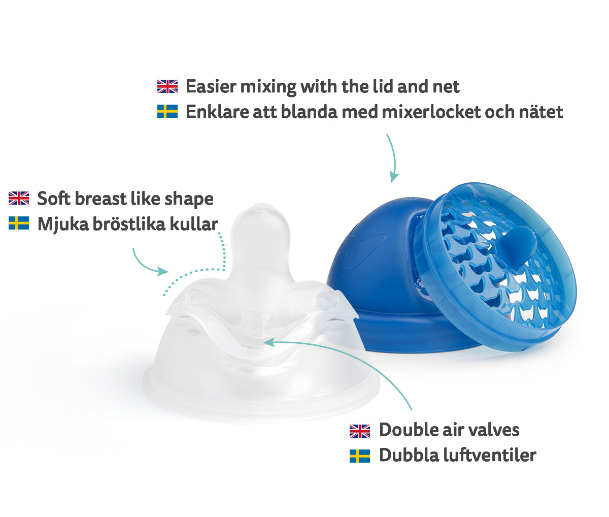 Det smarta mixernätet och locket gör det lättare att blanda t.ex. ersättning och välling direkt i flaskan och bidrar till en len och klumpfri blandning. Locket gör även flaskan läckagesäker.