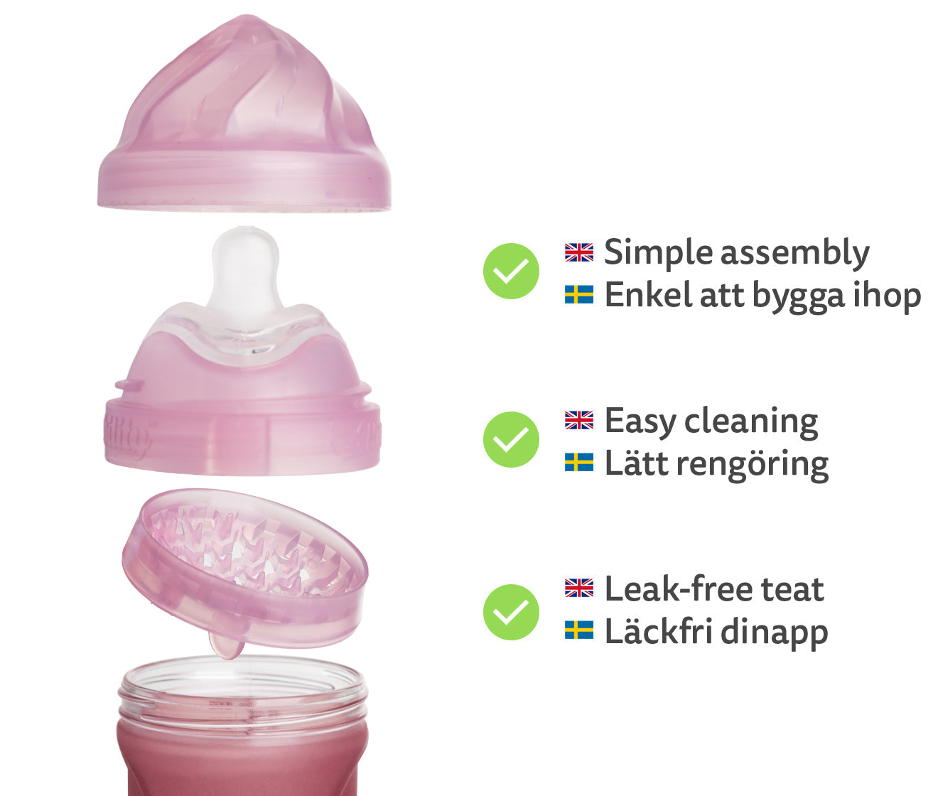 Viktigt, våra nappflaskor har en luftventil på insidan av dinappen för att förhindra vakuum i flaskan. Säkerställ att luftventilen på dinappen är öppen genom att försiktigt dra i den.