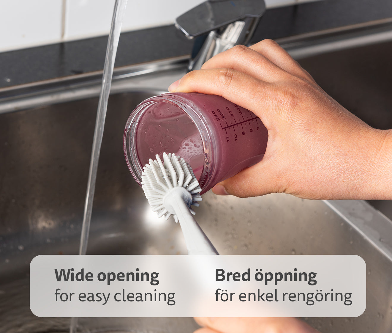 Vi rekommenderar att endast diska nappflaskan för hand. Om den diskas i diskmaskin (övre facket max 55 grader) är det viktigt att nappflaskan ej diskas ihop med matrester som innehåller olivolja, tomatsås eller andra pigmentstarka livsmedel. Detta kan missfärga plasten och göra så att måttskalan slits i förtid.