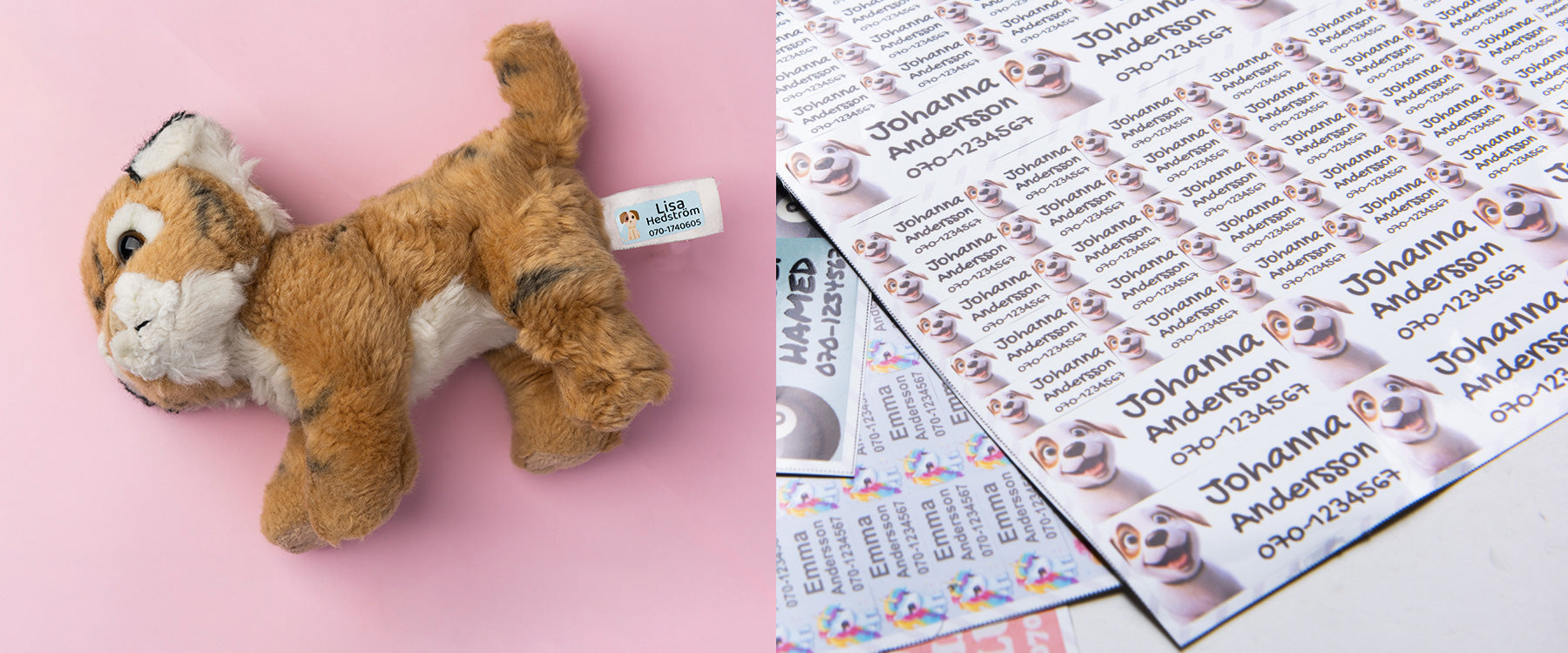 Du kan använda namnlapparna på flera olika material. Fäst dem på ditt barns skor, kläder, pipmuggar m.m.